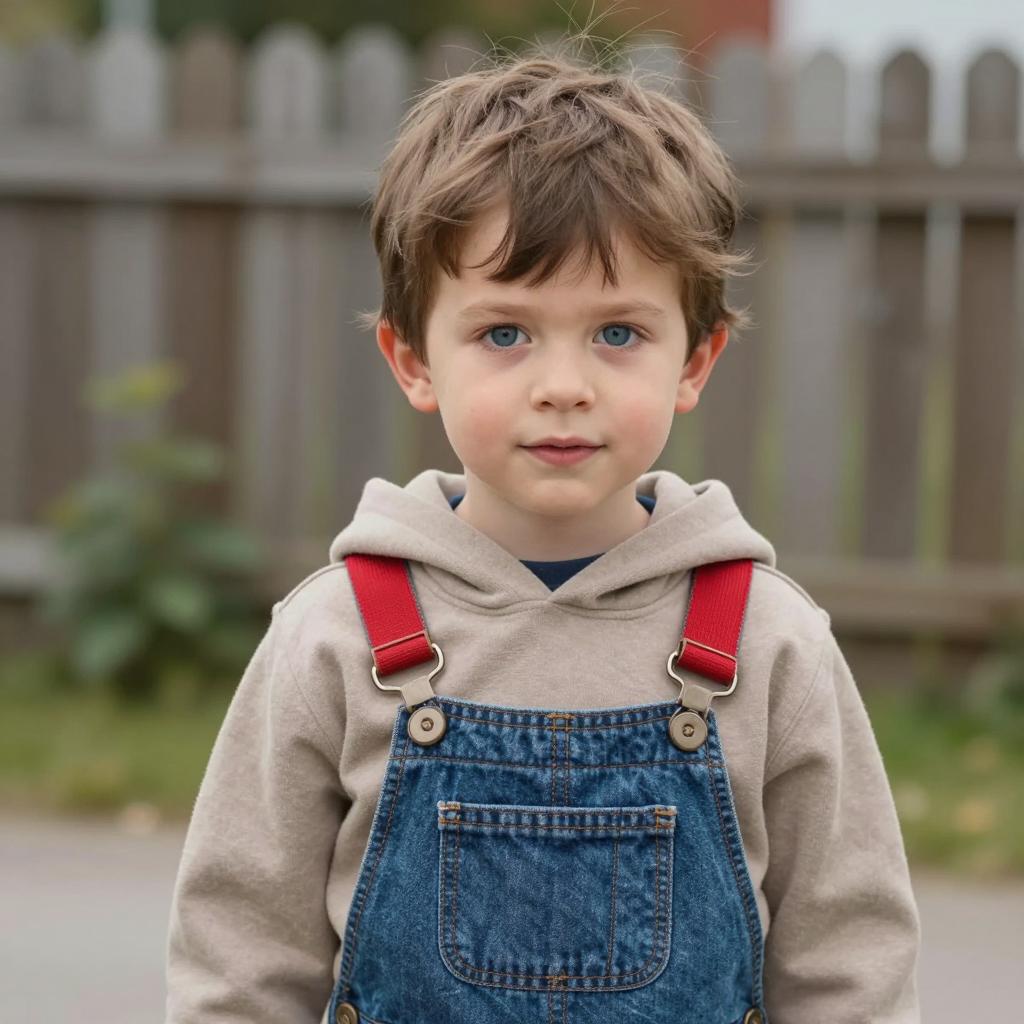 Bedroom costume boy, photograph of a cute young boy, light brown hair, standing with arms crossed, wearing grey hoodie, light blue jeans, and dark blue high-top sneakers with beige laces, beige carpet, neutral beige wall, brown baseboard, soft natural light, confident smile, casual pose, realistic style, daytime, indoor setting, boy slightly leaning to the right, relaxed atmosphere