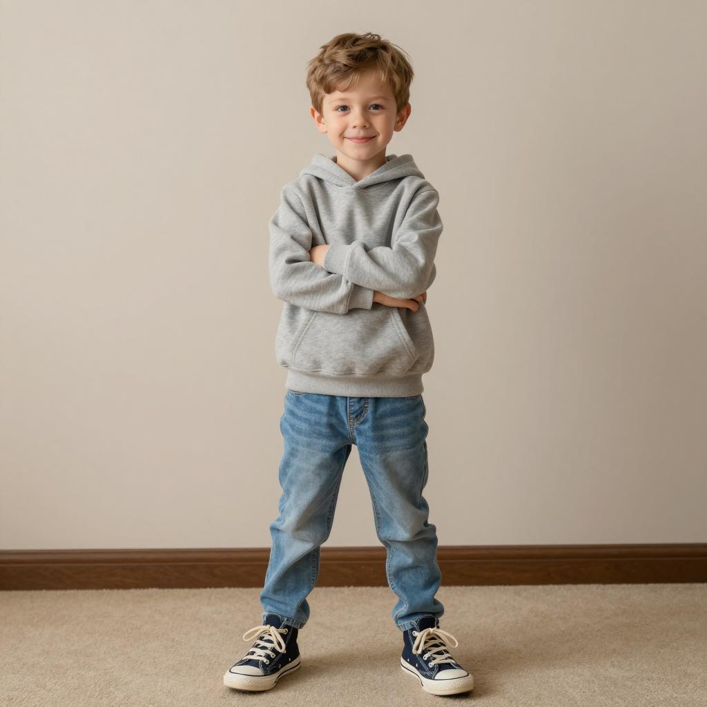 Photograph of a cute young boy with light brown hair standing indoors against a neutral beige wall and brown baseboard. The boy is wearing a grey hoodie, light blue jeans, and dark blue high-top sneakers with beige laces. He stands on a beige carpet with his arms crossed and a confident smile, captured in a casual and relaxed pose with soft natural daylight.