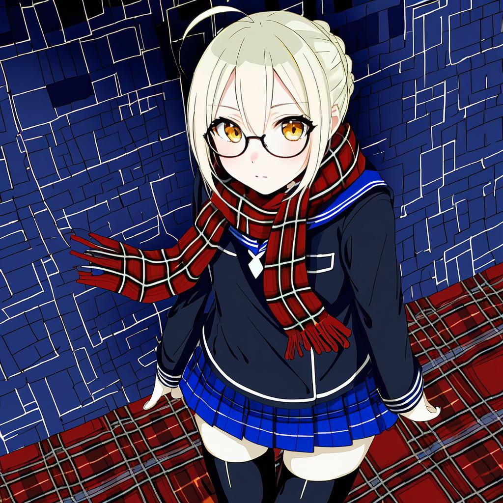 Mysterious heroine x alter (first ascension) (fate), fate (series), 1girl, yellow eyes, hair between eyes, glasses, black-framed eyewear, under-rim eyewear, blonde hair, short hair, ahoge, sidelocks, braid, french braid, serafuku, red scarf, plaid scarf, blue skirt, pleated skirt, black thighhighs, long sleeves, by artist parsley-f, anime
