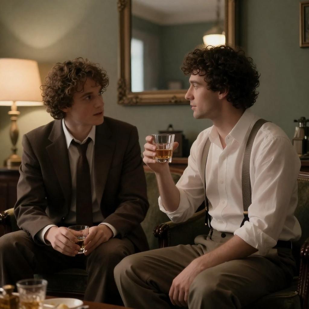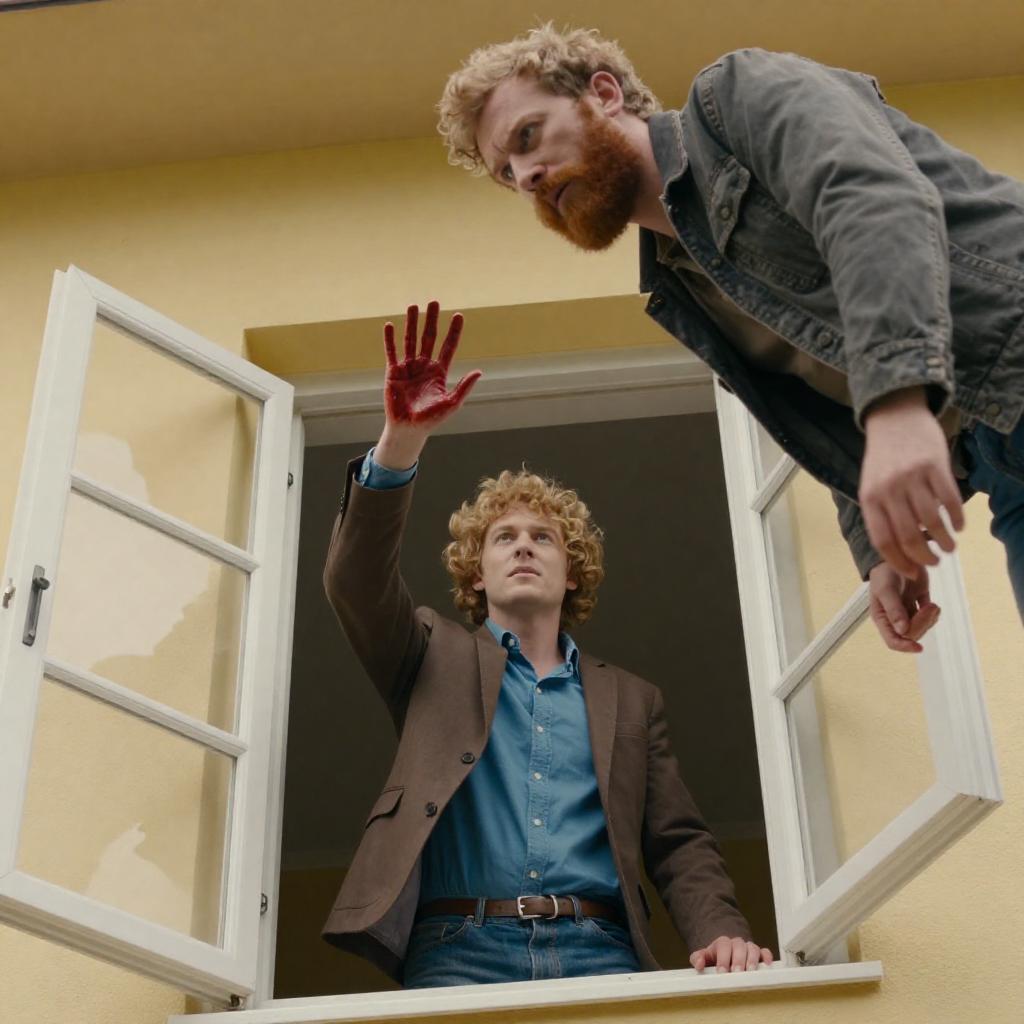 Photograph of a man with curly brown hair in a brown suit, reaching up towards a bleeding hand falling from a ceiling. The hand is reaching down with a bloodied arm. The ceiling is white with a square section, and the background has a yellow wall and a dark wooden door. The man's expression is focused upward. Two people, one partially visible above and one fully visible below. Intense, dramatic interaction.