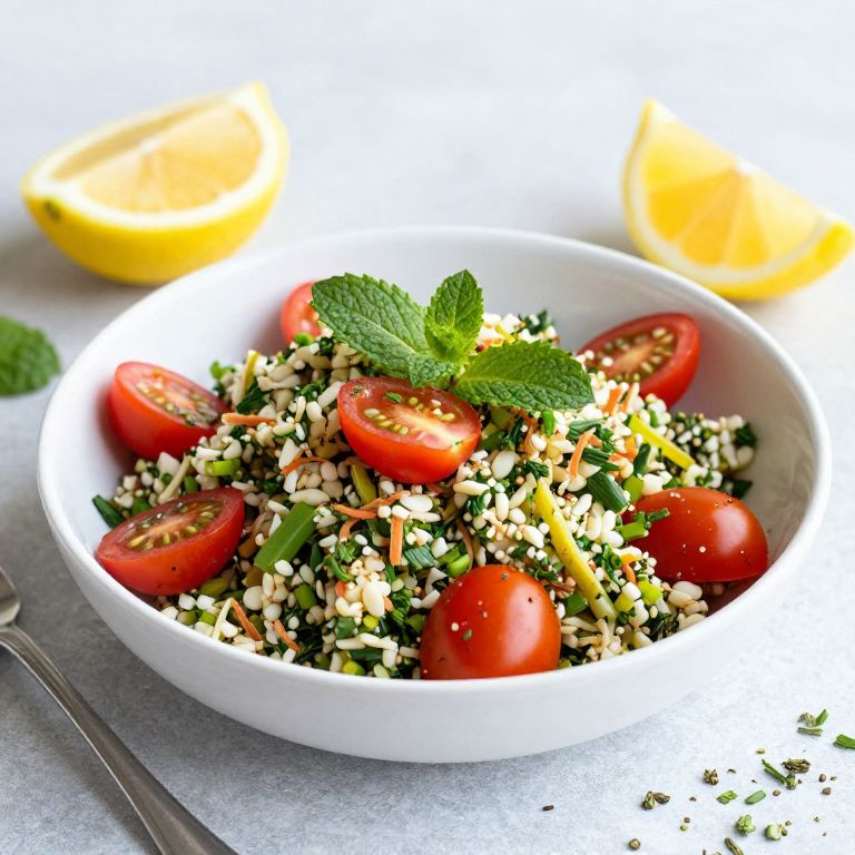 Crisp tabbouleh salad served in a white bowl, garnished with fresh mint leaves and vibrant cherry tomatoes, accompanied by a lemon wedge and scattered herbs on a light gray surface.