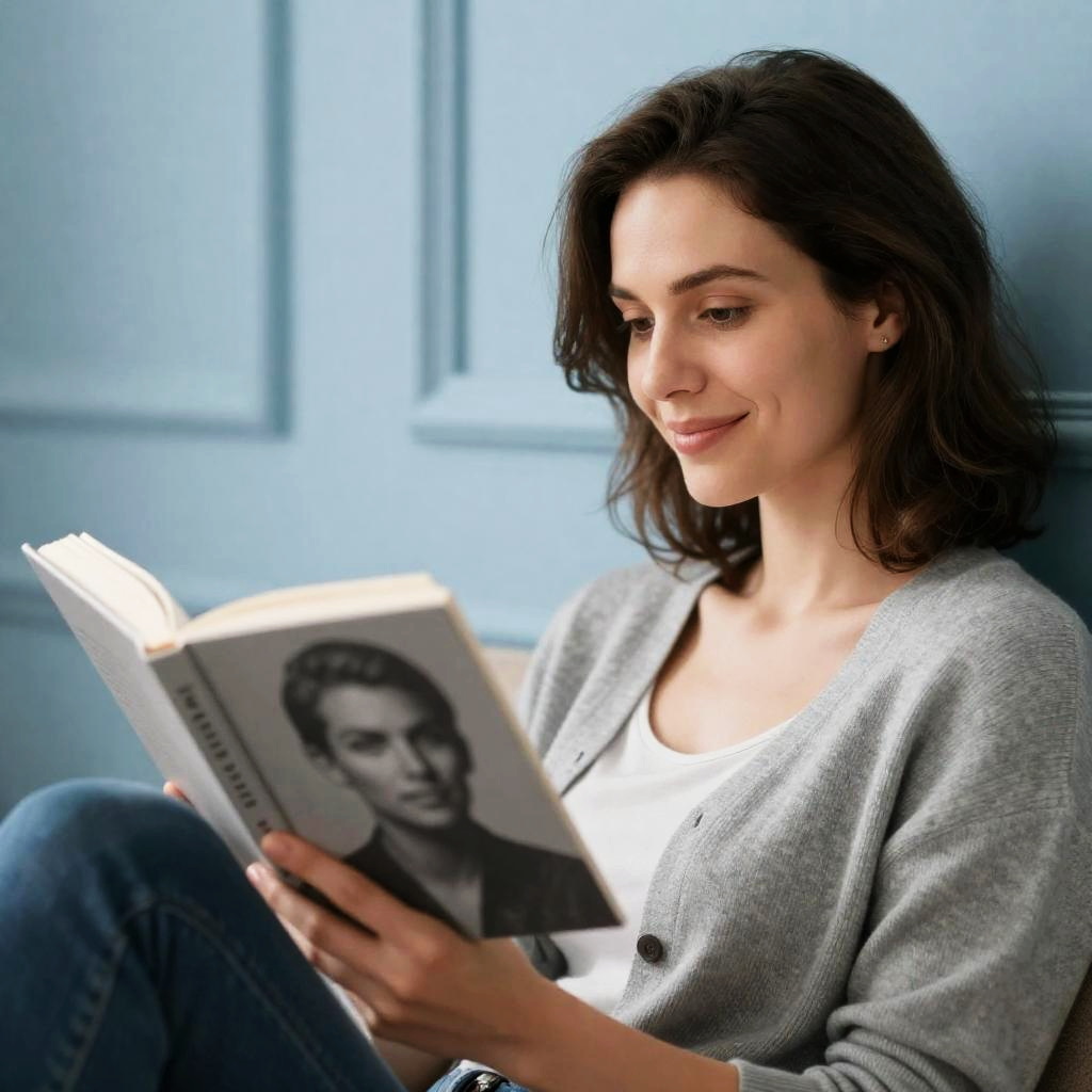 Woman with long brown hair, crouching, brown sweater, black pants, in dimly lit living room, wooden floor, book open on ground, books and chair in background, kitchen with cabinets and stove visible, natural light from window.