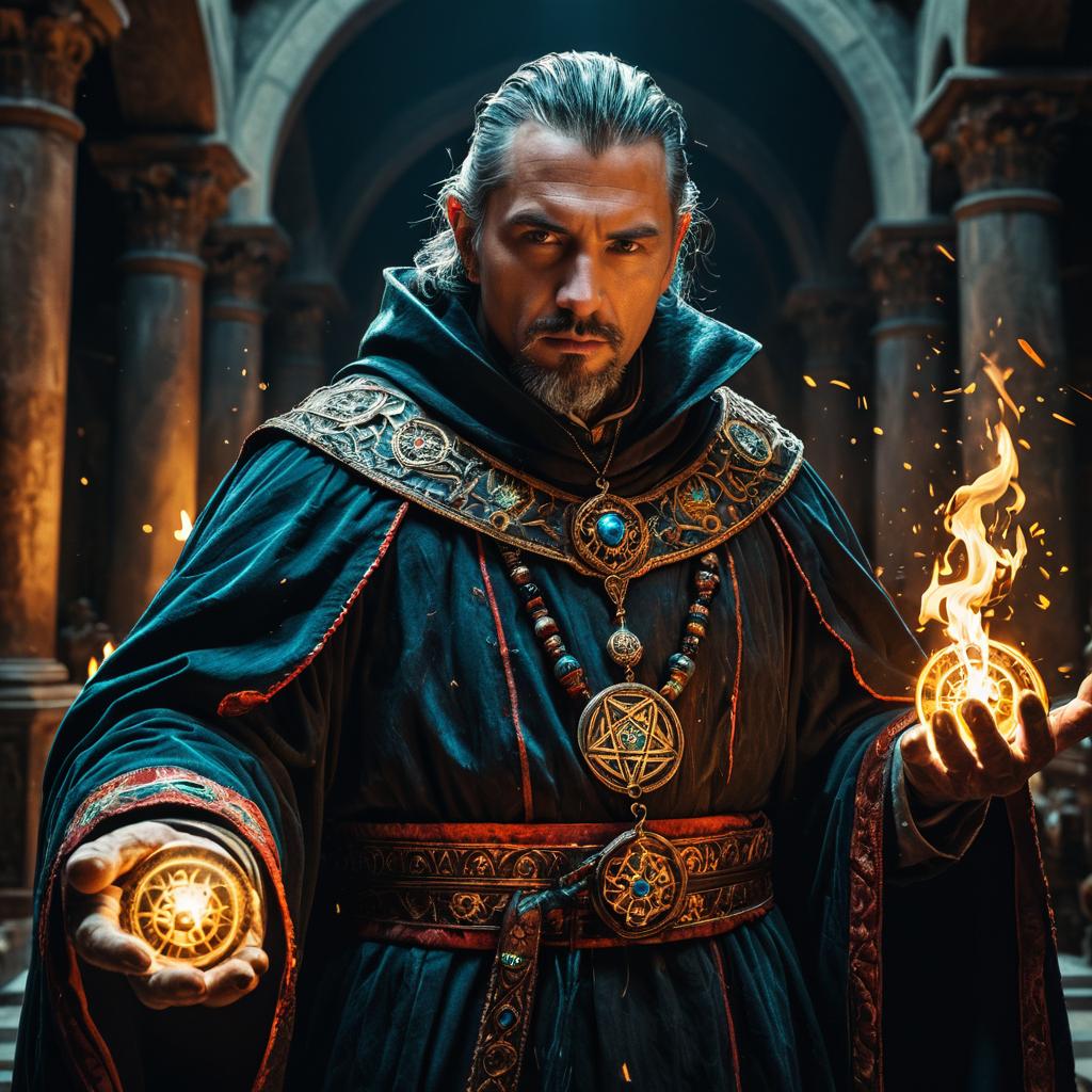 Photorealistic image of a dark sorcerer wearing intricate renaissance-style robes adorned with arcane runes and symbols. The figure has glowing orange eyes, dark mystic facial markings, and a hood covering his head. He stands in a dimly lit ancient temple with ornate carved pillars and a glowing circular rune behind him, creating a dramatic chiaroscuro lighting effect. The composition emphasizes fine details in the fabric, jewelry, and tattoo-like face paint, evoking a mystical and frightening atmosphere.