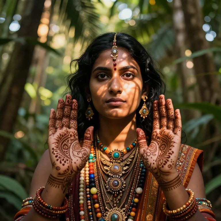Imagine a portrait photograph of an enigmatic South Asian mystic with intense dark eyes and intricate henna patterns adorning their palms. Captured from a low angle, it presents them as if through a dreamlike lens. Soft golden light filters through the lush foliage of a tropical forest, casting dancing shadows across their smooth, unlined face and ornate attire adorned with vibrant beads and precious stones. This scene evokes ancient wisdom and serene tranquility, drawing viewers into an emotional journey between reality and the mystic's ethereal realm.