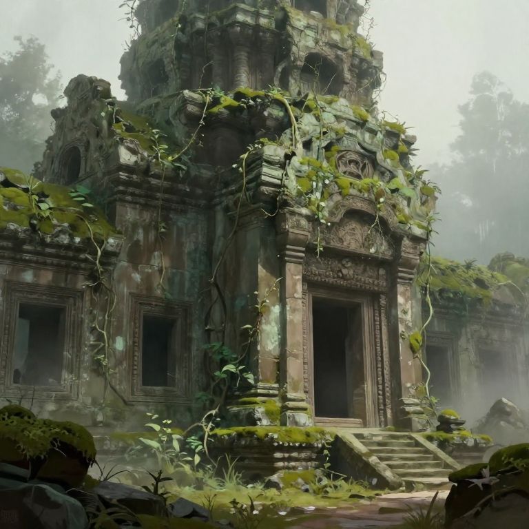 Digital artwork of a moss-covered, ancient temple ruin with vines and overgrown vegetation, featuring intricate carvings and dark, empty doorways.