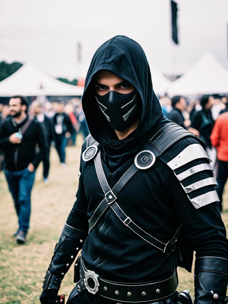 Man in Modern Assassin Costume, candid cosplay portrait at festival
