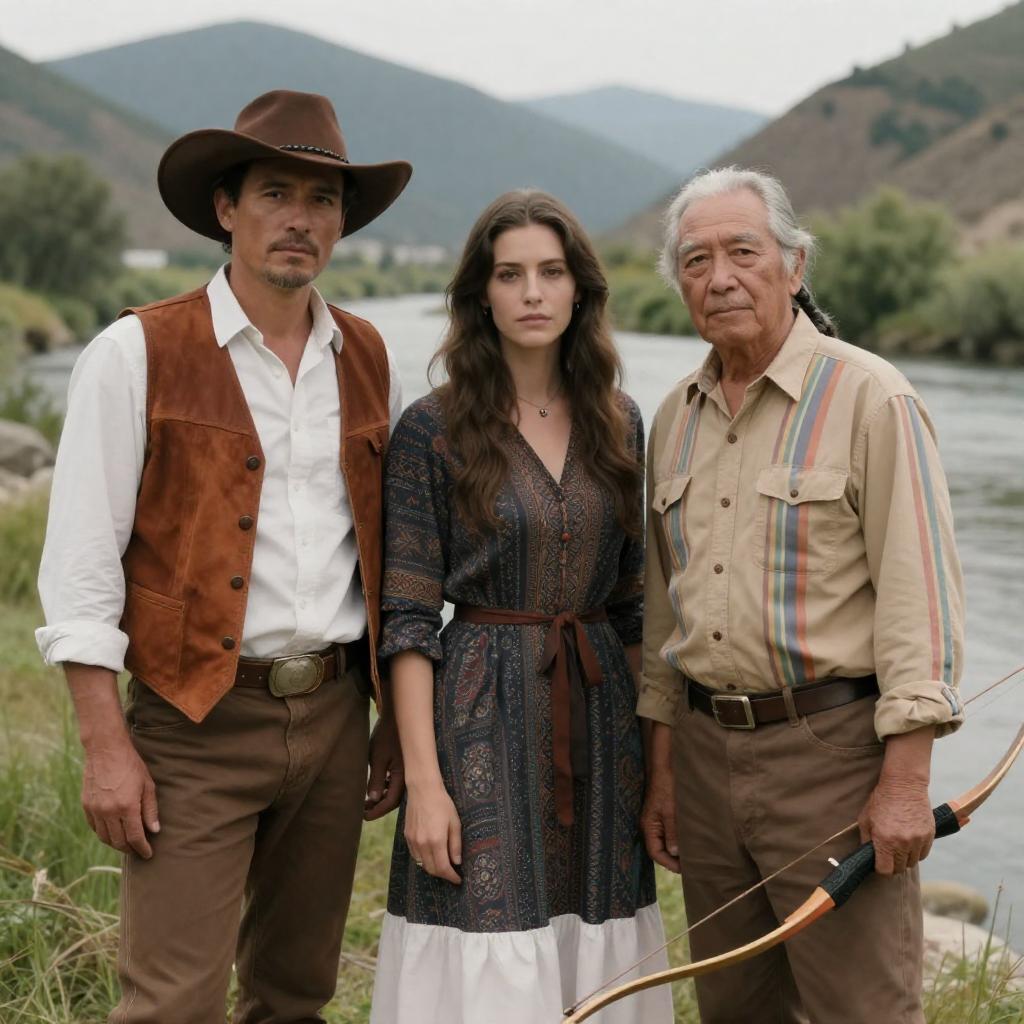Photograph of three men crouching among large rocks. Left man with dark hair, headband, Native American attire, serious expression. Middle man in grey shirt, brown vest, white cowboy hat, slightly smiling. Right man with dark hair, red shirt, focused expression. Background includes horses and rocky terrain.