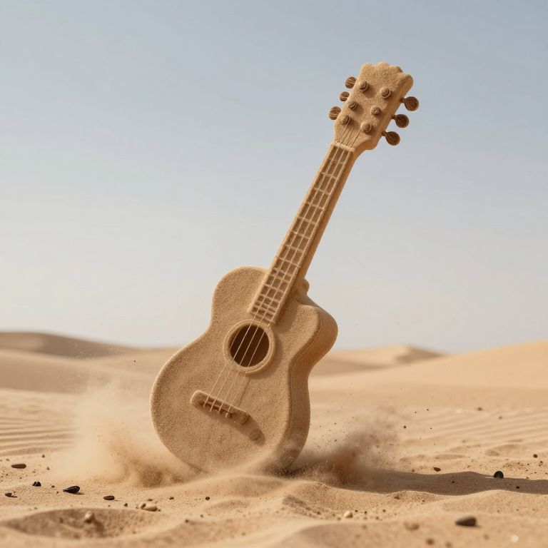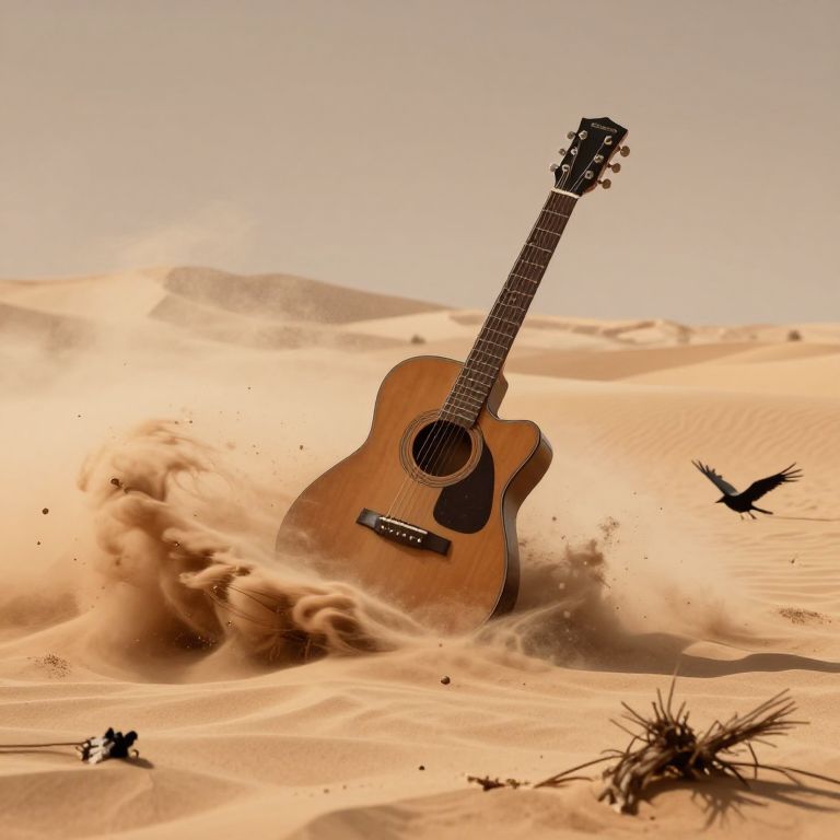Photograph of a wooden acoustic guitar being forcefully pushed into golden sand dunes under a clear blue sky, with sand swirling around it.