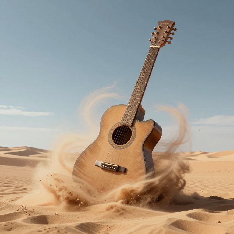 Photograph of an acoustic guitar with a light brown, wooden finish, being forcefully thrust into a sandy desert. The guitar is tilted slightly to the right, with sand swirling around its base, creating dynamic motion. The clear blue sky forms the background, contrasting with the beige sand. The guitar's strings, frets, and rosette are visible, with the soundhole centered. The sandy texture is detailed, showing ripples and small dune formations. The image captures a sense of sudden impact and movement, with the sand's motion blurred to emphasize the force of the guitar's entry.