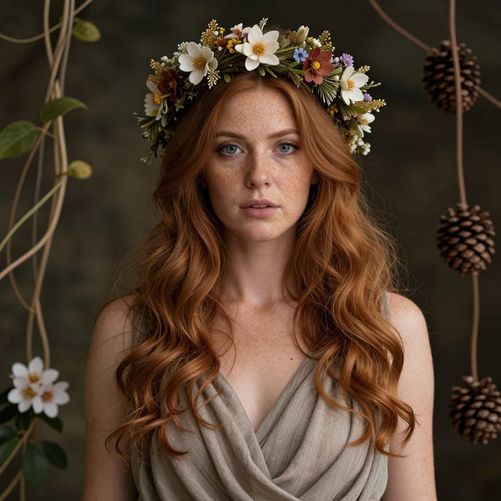 A woman with ginger hair and freckles wears a floral crown and a draped garment, surrounded by nature elements like vines, flowers, and pine cones.