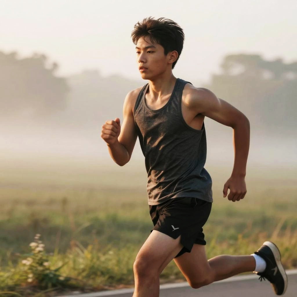 Photograph of an Asian man with short black hair, wearing a dark grey sleeveless shirt, doing a push-up on a sunny concrete surface outdoors.
