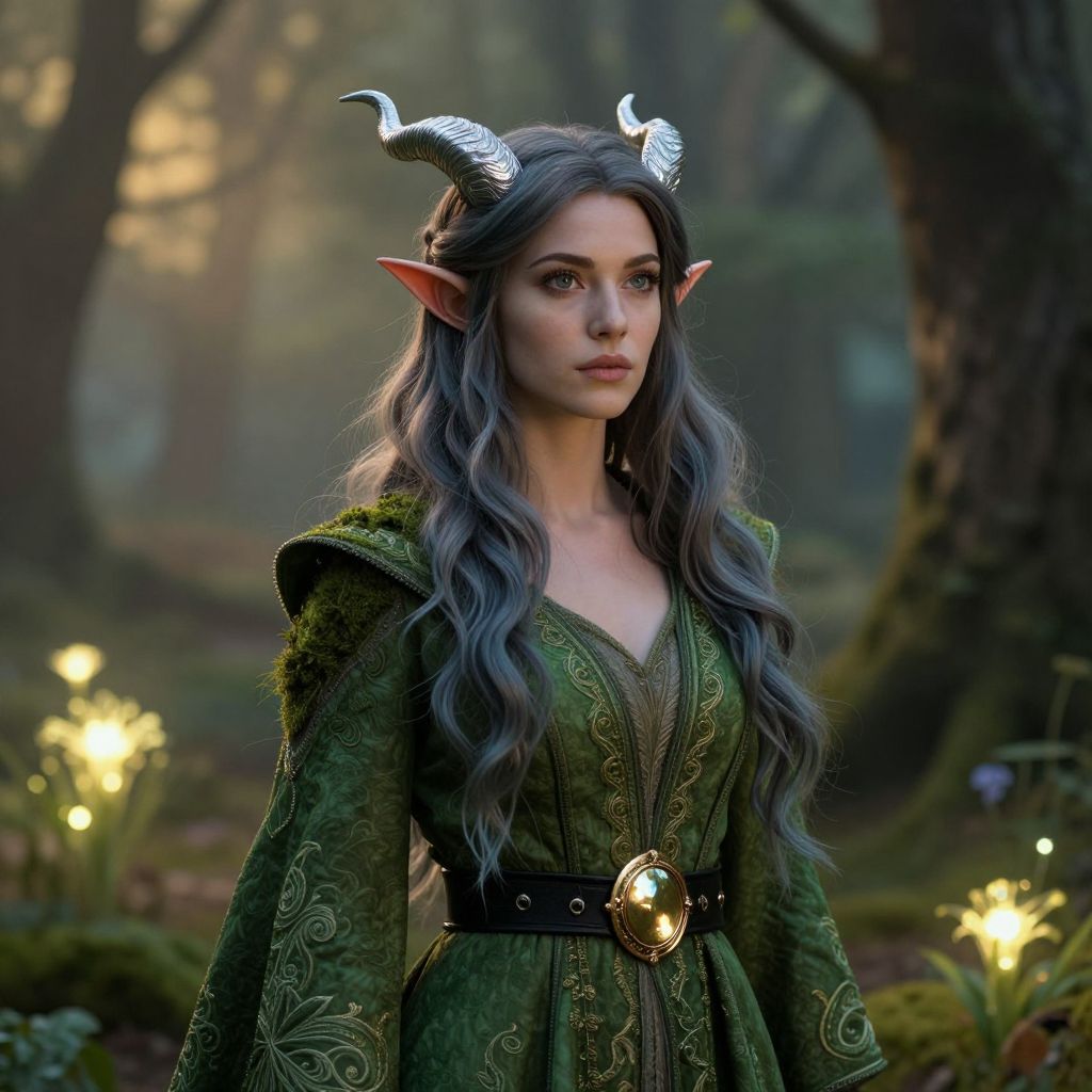 A graceful female elf with pointed ears and delicate, shimmering silver horns adorning her head, her long flowing hair the color of moss and twilight. She wears a elegant green coat with intricate embroidery, fastened by a sturdy black belt and a polished gold buckle that glints under soft ambient light. Her eyes are bright and wise, reflecting both curiosity and quiet strength. She stands in a mystical forest clearing, surrounded by glowing flora and soft golden morning light filtering through the trees, exuding a serene and otherworldly presence.