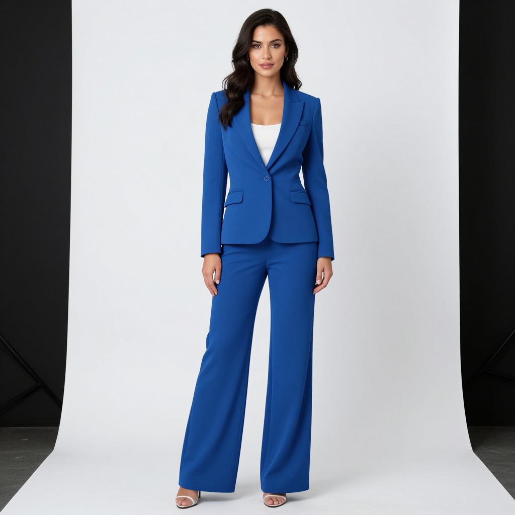 Photograph of a confident woman standing against a stark black and white backdrop. She has long, wavy black hair, fair skin, and dark eyes. She is wearing a vibrant royal blue, tailored, single-breasted blazer over a white V-neck top, paired with matching blue wide-leg trousers. Her feet are adorned with silver, open-toe high heels. The background is minimalistic, featuring a white roll-out backdrop that creates a high-contrast effect, making her blue suit stand out prominently. The overall style is professional and chic, emphasizing her poised and elegant appearance.