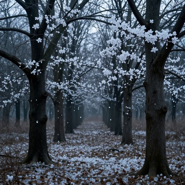 Photograph of a misty forest with leafless trees, snow-dusted ground, and delicate white blossoms, creating a serene, ethereal winter