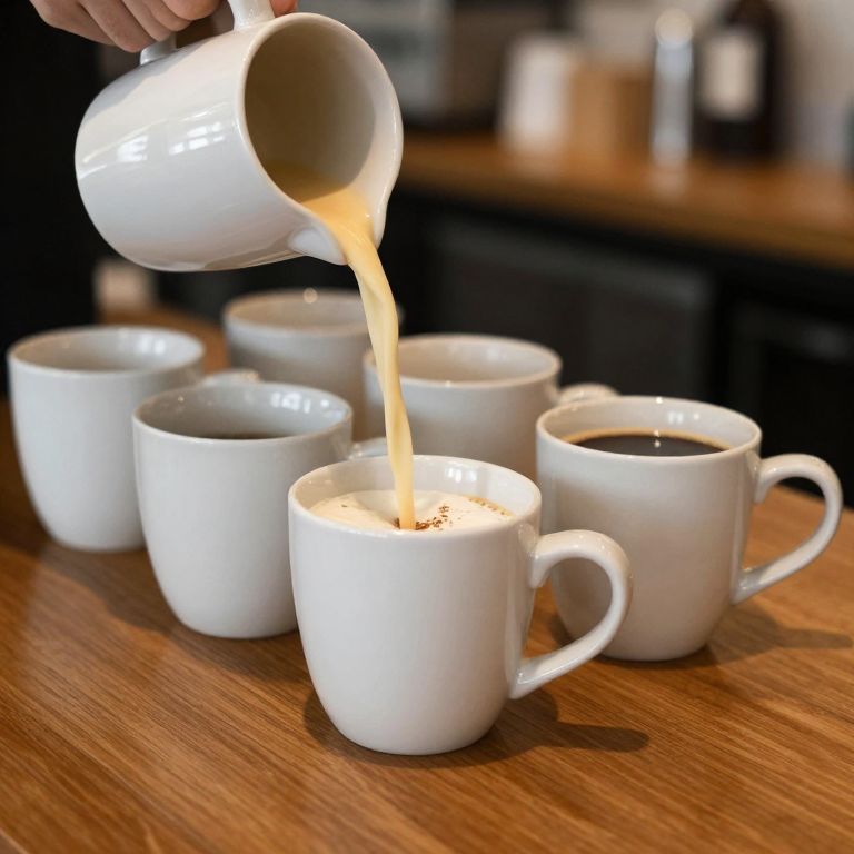 Photograph of a white ceramic pitcher pouring light brown coffee into five matching white ceramic cups arranged in a row on a wooden table. The coffee flows smoothly, creating a small foam on top of one cup. The background is blurred, featuring dark kitchen cabinets and indistinct kitchenware, suggesting a cozy, indoor coffee shop setting. The hand holding the pitcher is partially visible at the top left corner, with the focus on the action of pouring. The light highlights the glossy texture of the cups and the warm wood grain of the table.