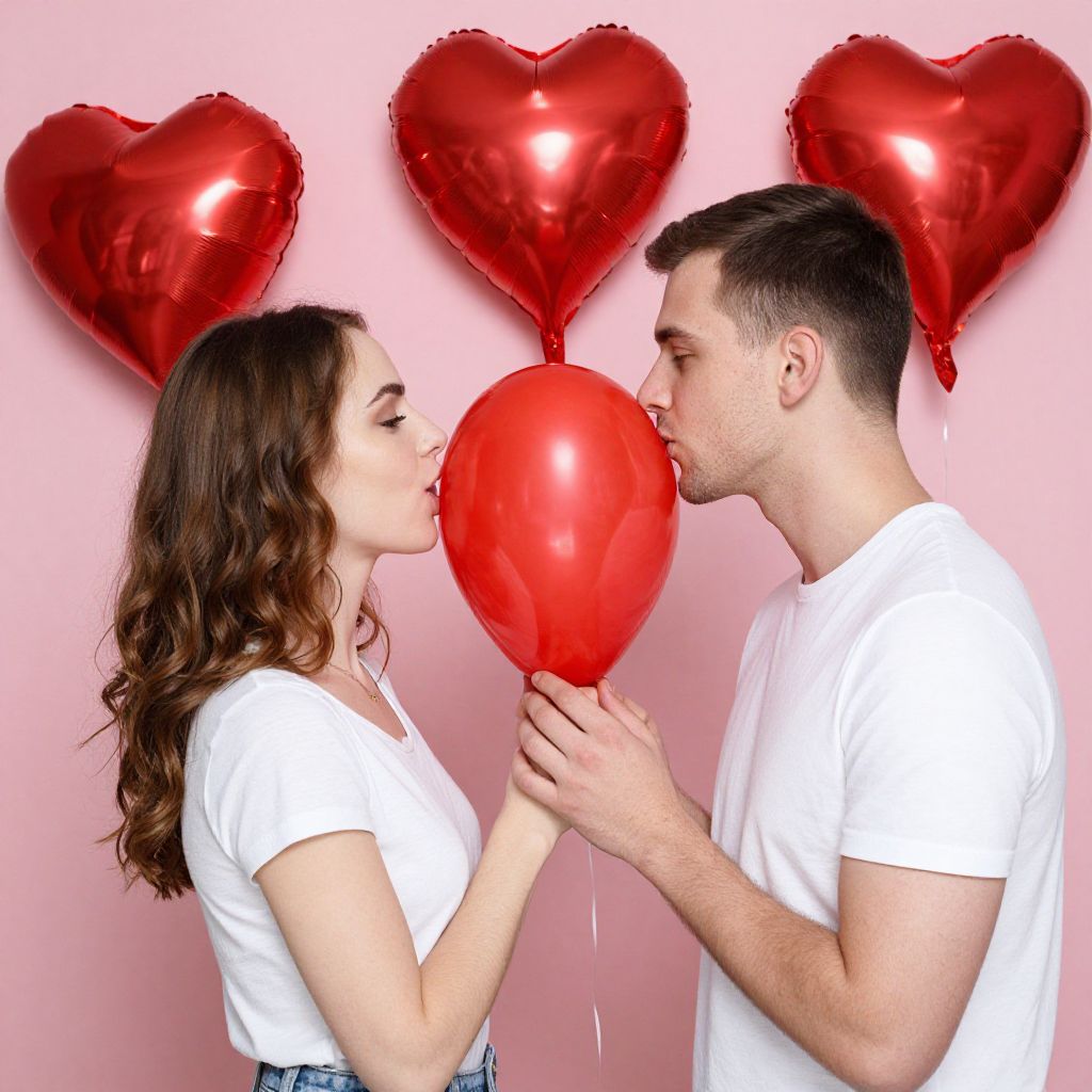 Romantic couple sharing a playful moment with heart-shaped balloons, as the woman holds a red balloon between them while the man gently kisses it, set against a soft pink backdrop.