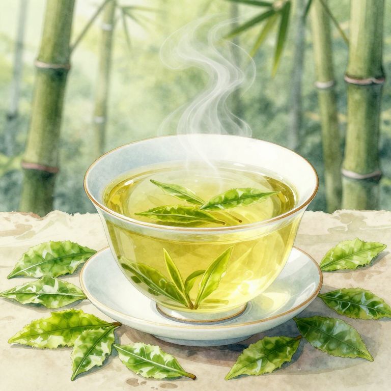 Greentea in a delicate porcelain cup surrounded by fresh green tea leaves, soft natural light filtering through a bamboo forest background, steam gently rising from the cup, emphasizing tranquility and freshness, detailed close-up, watercolor style.