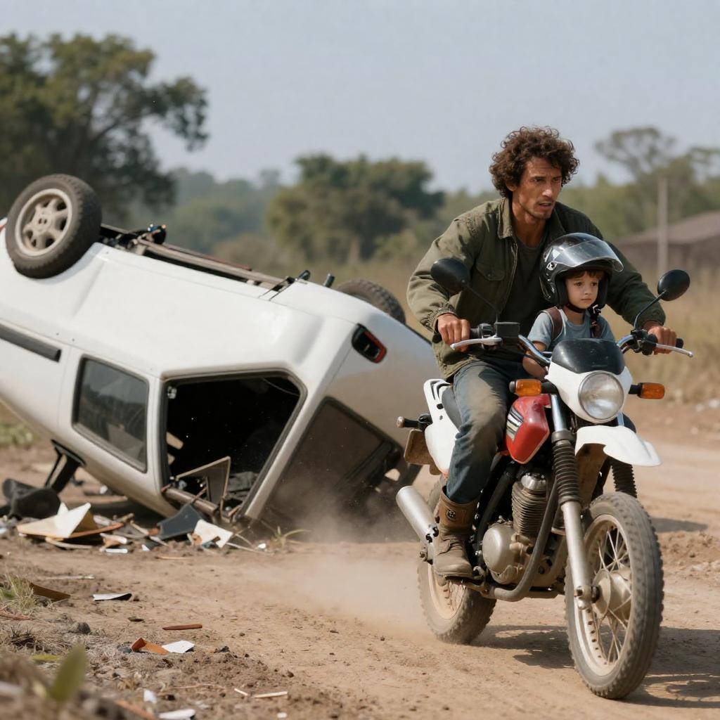 Photograph of a rugged scene: a man with curly hair and a green jacket rides a motorcycle, holding a child in a helmet. A flipped, overturned white car crashes behind them, with debris scattered on the dirt ground. The background shows trees and a clear sky. The man's intense expression contrasts with the child's calm demeanor.