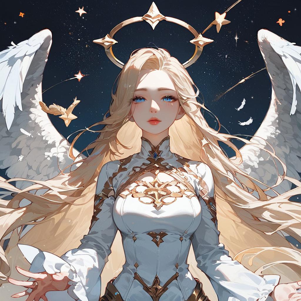 Score_9, score_8_up, score_7_up, source_anime, rating_safe, fantastic, colorfull, close up shot, front view, intricate details, (1girl(human, very long blond hair, angel, beautiful starry eyes, looking the viewer, halo)), fancy, flying, (reaching towards viewer hug), breast focus, (foreground(stars, feathers, shooting stars)), background(rings light, wings, stars, starfall, shooting stars)