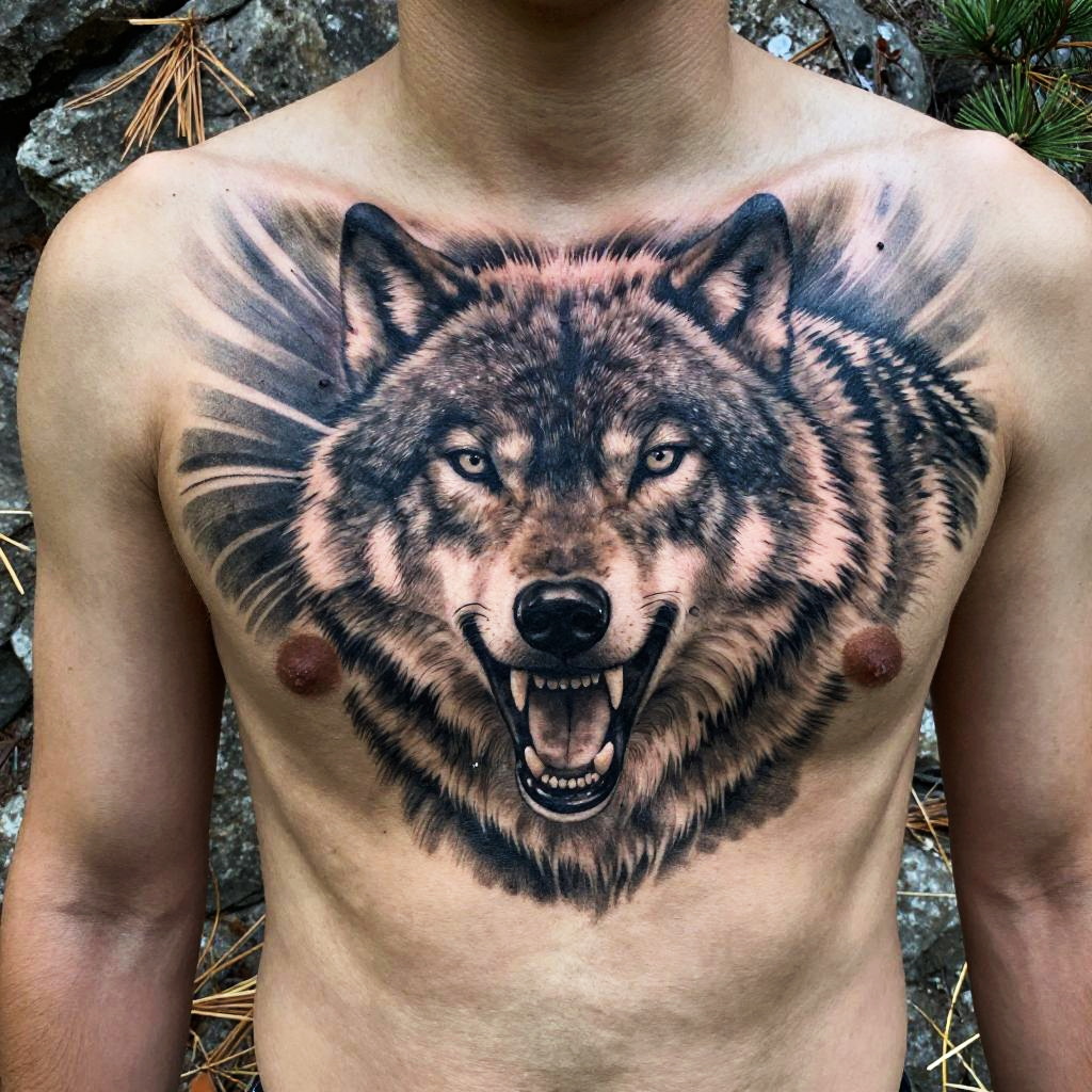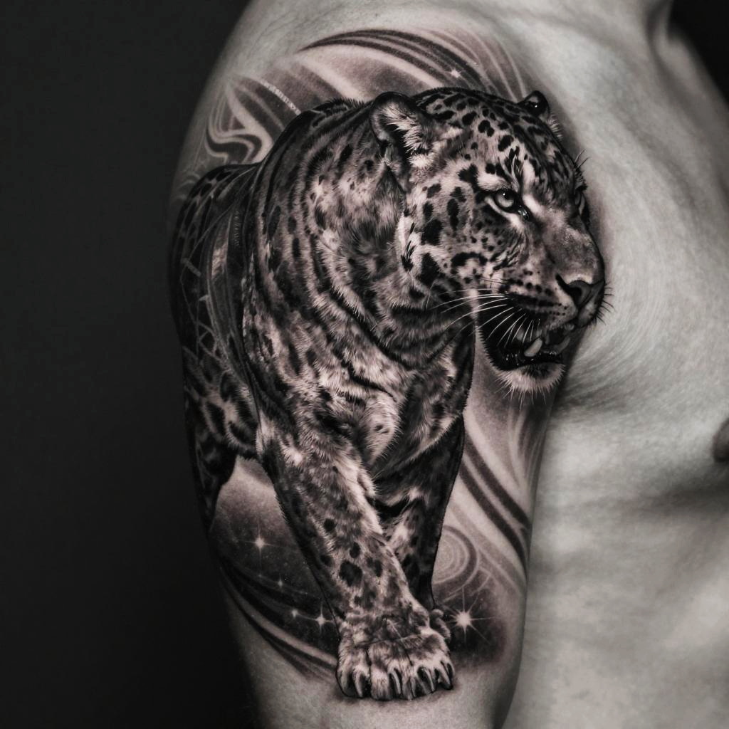 Black and white panther tattoo, close-up of snarling panther with realistic shading emphasizing muscle tone and fur pattern, dramatic shadows and highlights, meticulous attention to whiskers and eyes, dynamic composition suitable for chest or back tattoo, blending realism with stylized flair