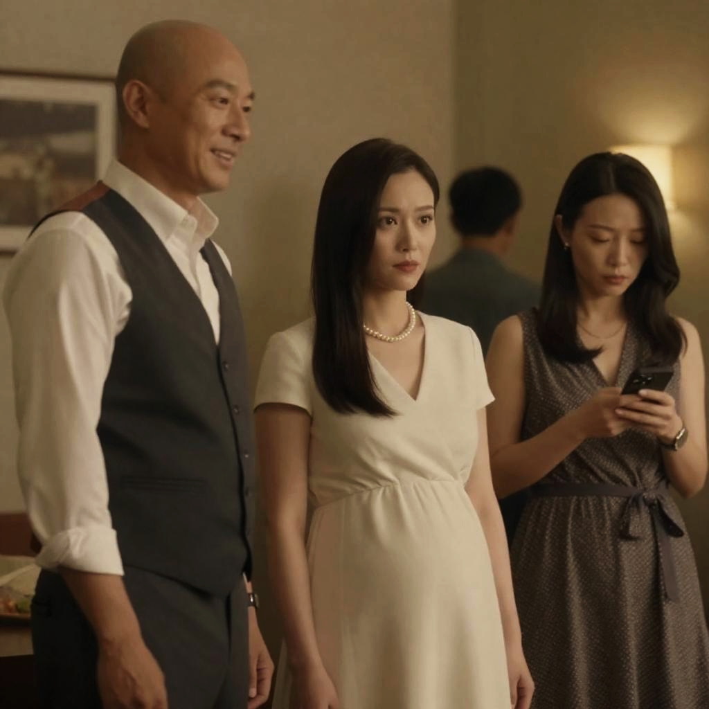 Photograph of three people in a dimly lit room. Bald man in vest and white shirt stands left, smiling at pregnant woman in white dress with pearl necklace, center, looking stern. Black-haired woman in patterned dress stands right, looking down at phone. Background includes blurred figures and warm lighting.
