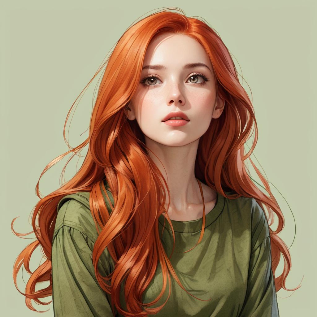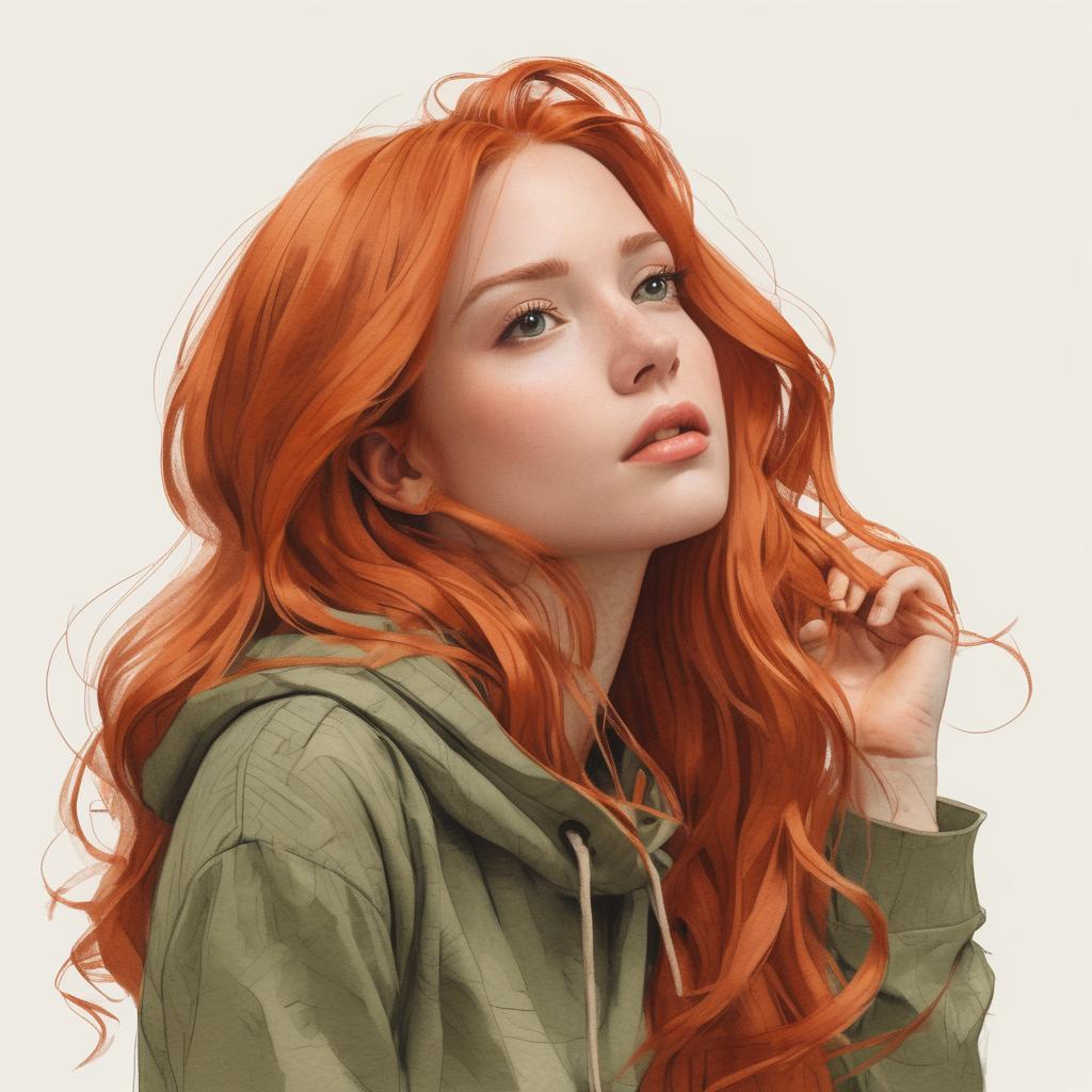 Portrait of a young woman with long red hair looking upward with a thoughtful expression, expressive sketch style with soft shading, warm color scheme featuring red and orange hair hues and olive green clothing, hand-drawn aesthetic with loose lines and delicate texture, neutral background
