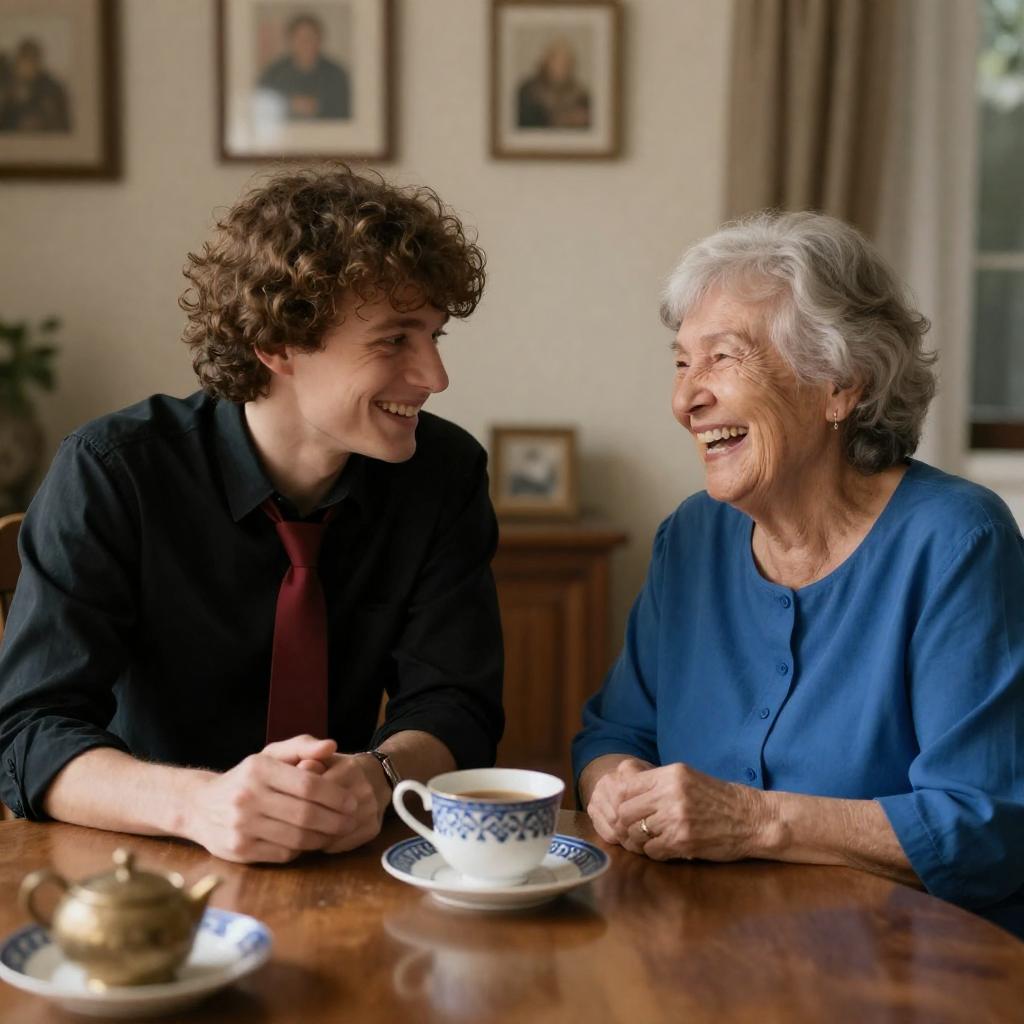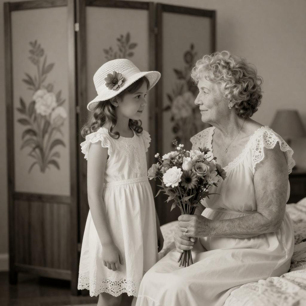 Sepia-toned photograph of a young girl in a white dress and hat with a flower, standing beside an elderly woman with curly hair, wearing a lace-trimmed nightgown, in a bedroom. The elderly woman holds a bouquet of flowers. Background features a wooden folding screen with floral patterns. The girl looks down at the elderly woman.