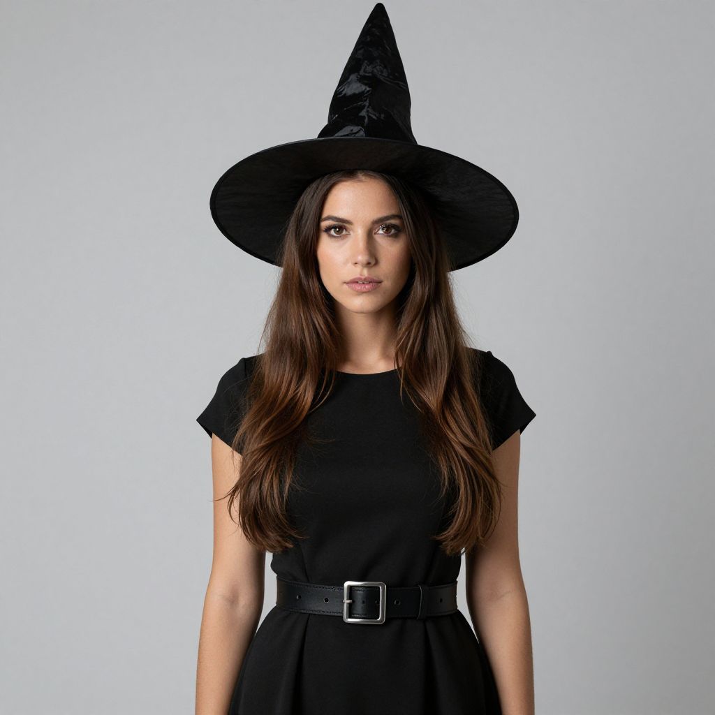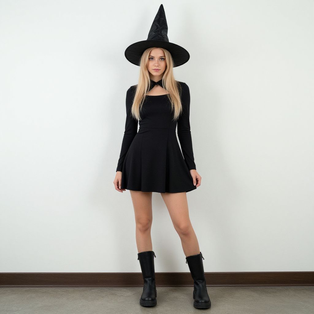 "witch mom costume, 1girl, hat, solo, witch hat, blonde hair, dress, standing, witch, boots, black footwear, full body, looking at viewer, black headwear, long sleeves Realistic photo of casual sexy person with pretty face"