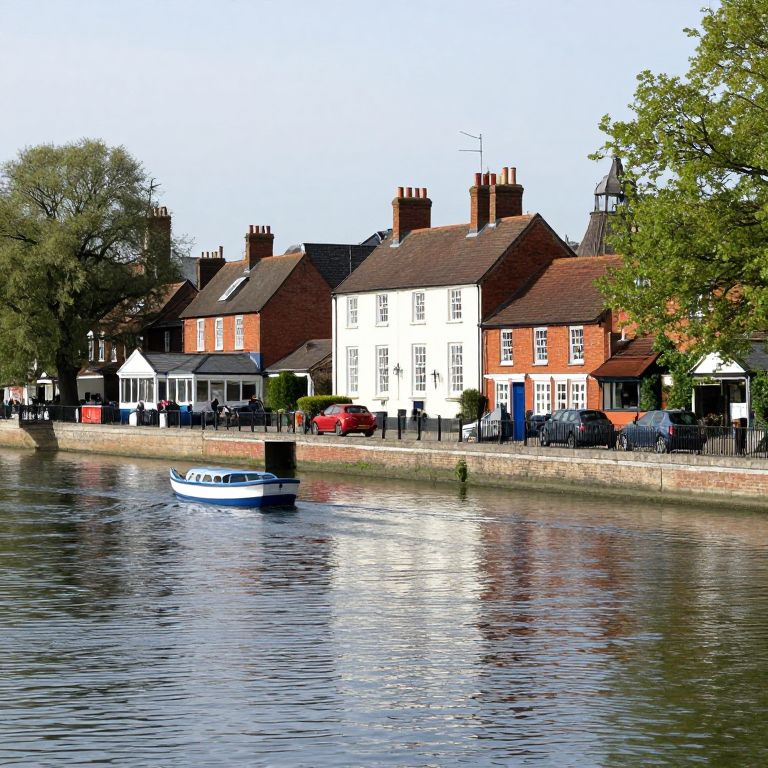 Photograph of a quaint riverside village. A small blue and white rowboat floats on the calm river in the foreground. The background features charming red-brick and white-painted terraced houses with brown roofs, tall chimneys, and black wrought-iron railings. Trees with green foliage are on the right, while a few parked cars are visible near the houses. The clear sky and bright sunlight cast sharp shadows, enhancing the vibrant colors and peaceful atmosphere of the scene.