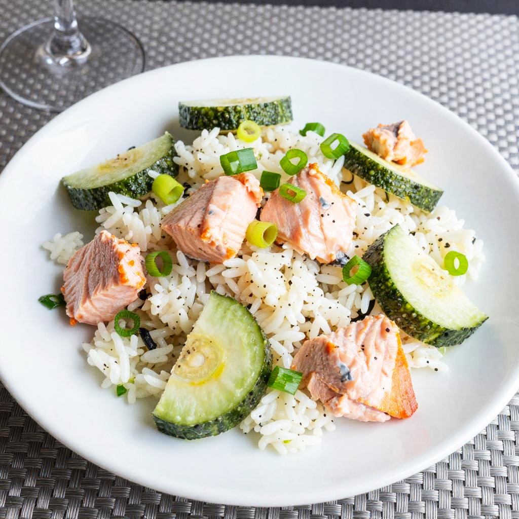 Close-up photo of a colorful salad on a white plate. The salad has mixed white rice, chunks of pale pink salmon, green cucumber slices, and bright green onions. The background is a textured, woven silver placemat. A partially visible, empty wine glass is in the top left corner. The image has a high contrast and vibrant colors.
