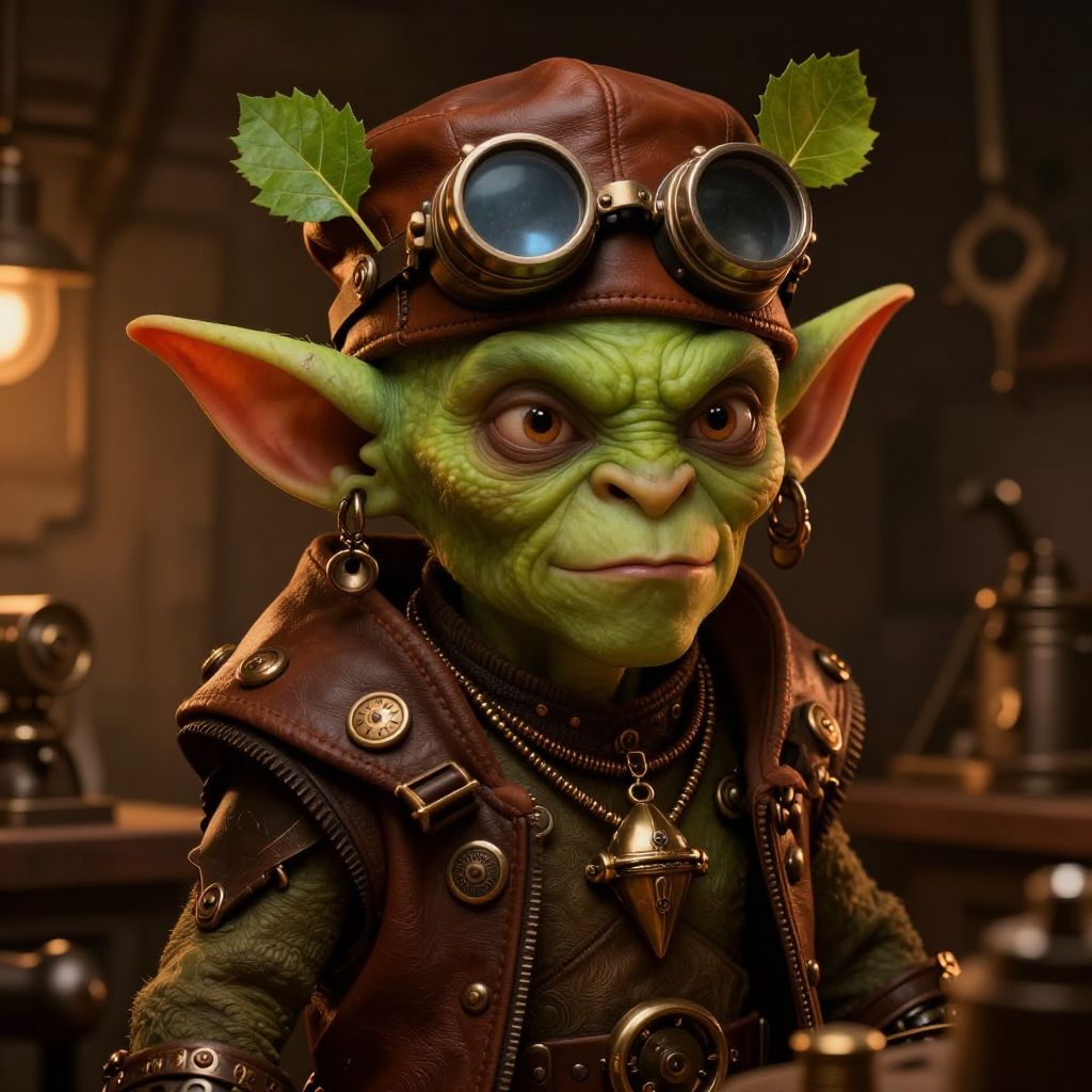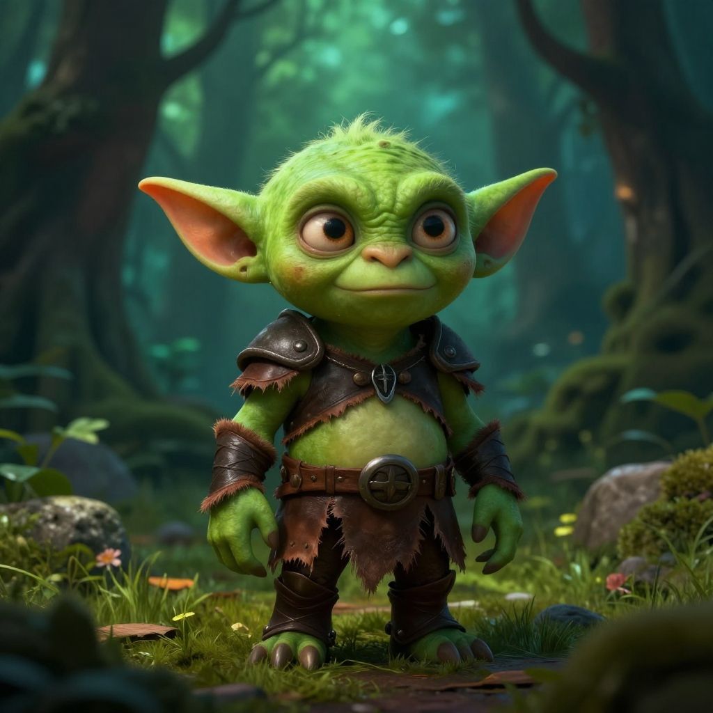Young goblin standing in a mystical forest clearing, vibrant green skin, large pointy ears, mischievous eyes, wearing ragged leather armor, fantasy art style, detailed background