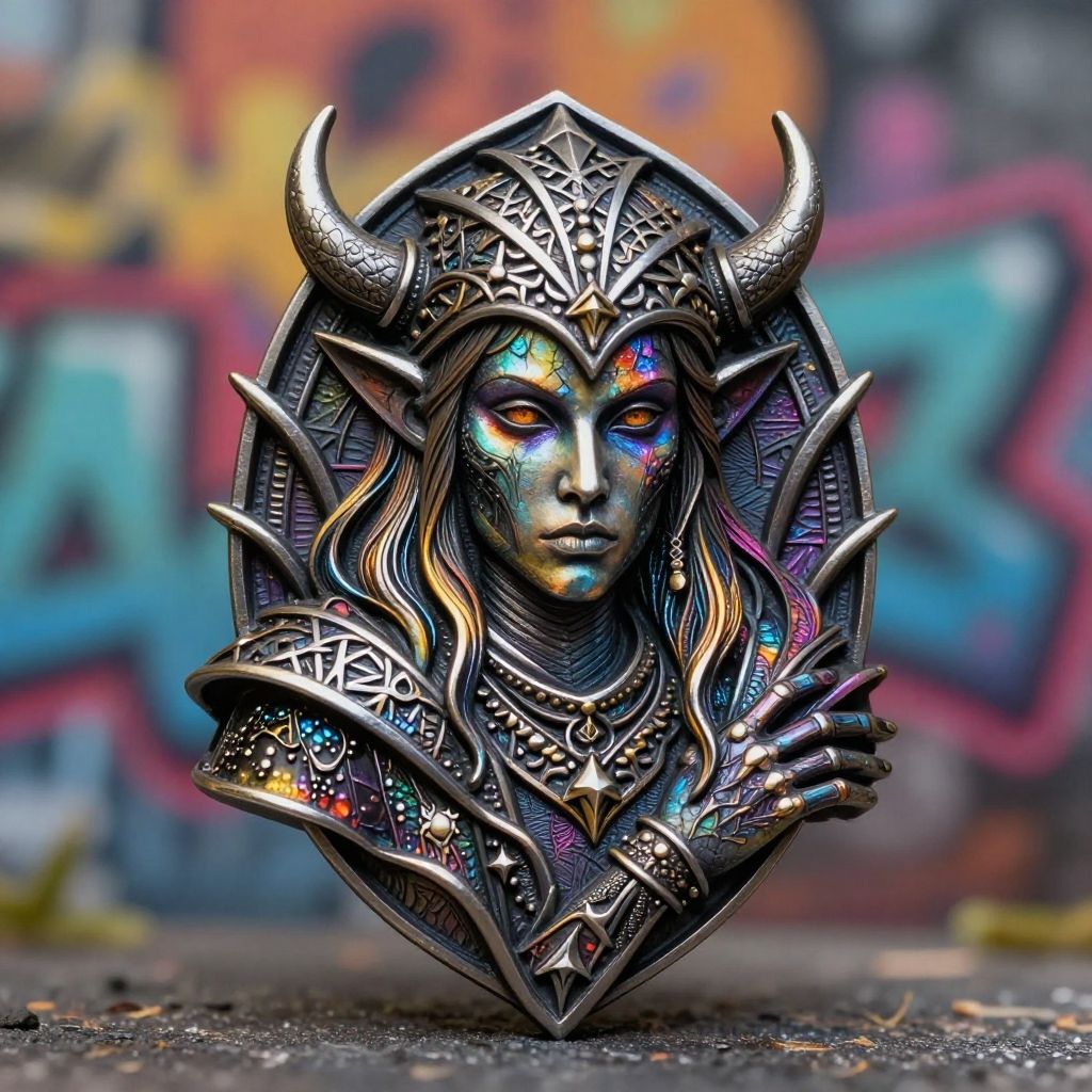 Metal trinket depicting a Sultai Scavenger Ashley Wood, natural, shimmering, vibrant, gothic, rpg, 1400ad, ultra detailed, detailed, immersive, reminiscent of high fantasy RPG games, HD, masterpiece, best quality, hyper detailed, super realistic, perfect face, perfect hands, award-winning, professional, breathtaking, linquiveralonely Bayouvicious weathergraffiti style . street art, urban, tag