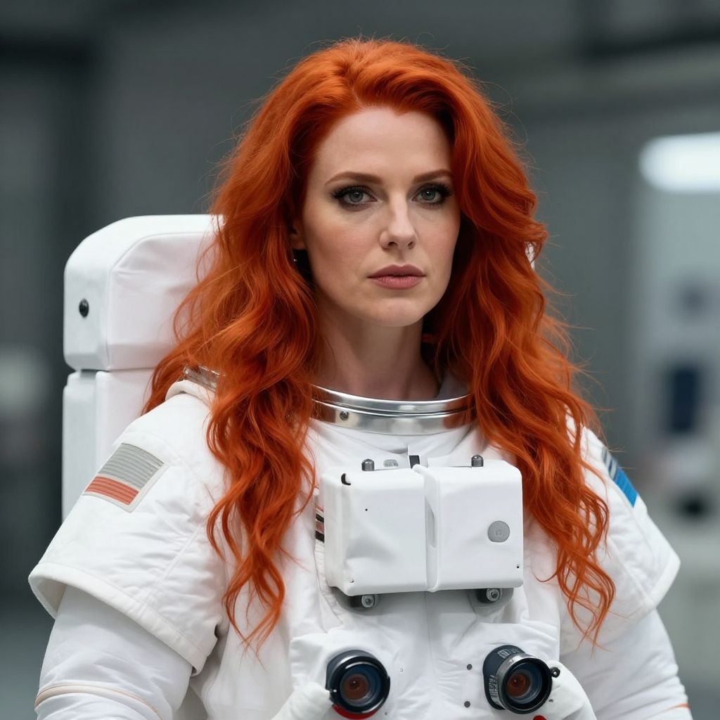 Female astronaut with long fiery red hair, milf, every-day, Ultra-HD-photo-same-realistic-quality-details