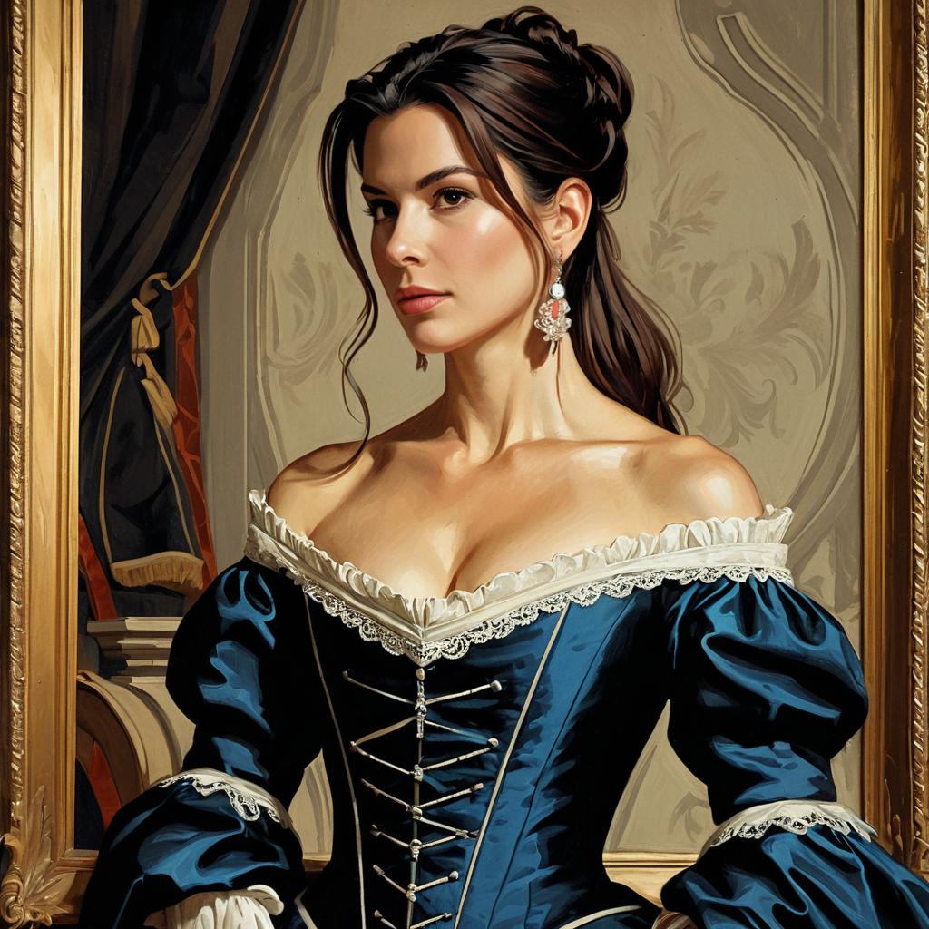 Portrait of a young beautiful attractive sandra bullock as glamour model wearing 17 th century french off - the - shoulder neckline bodice, jodhpurs greg manchess painting by sargent and leyendecker, studio ghibli fantasy close - up shot asymmetrical intricate elegant matte painting illustration hearthstone, by greg rutkowski by greg tocchini by james gilleard