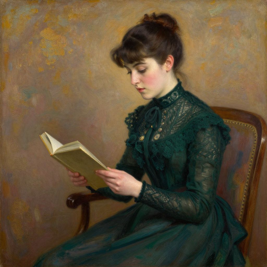 A Scottish Post-Impressionist oil painting portrays a young woman engrossed in reading, dressed in a dark green dress with intricate lace detailing, set against a warm, vintage backdrop that enhances the timeless elegance of the scene.