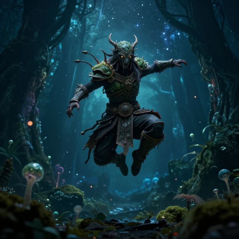 Digital fantasy artwork depicting a horned, demonic figure mid-jump in a mystical forest. The creature has pale, glowing skin, dark armor with green moss-like accents, and a menacing, horned mask. It wears a tattered, black cloak with a large, silver belt buckle. The forest is dense with glowing mushrooms, moss-covered trees, and ethereal blue light filtering through the canopy. The background is dark and mysterious, with floating particles and a sense of magic in the air. The image has a high-contrast, vibrant, and otherworldly aesthetic.