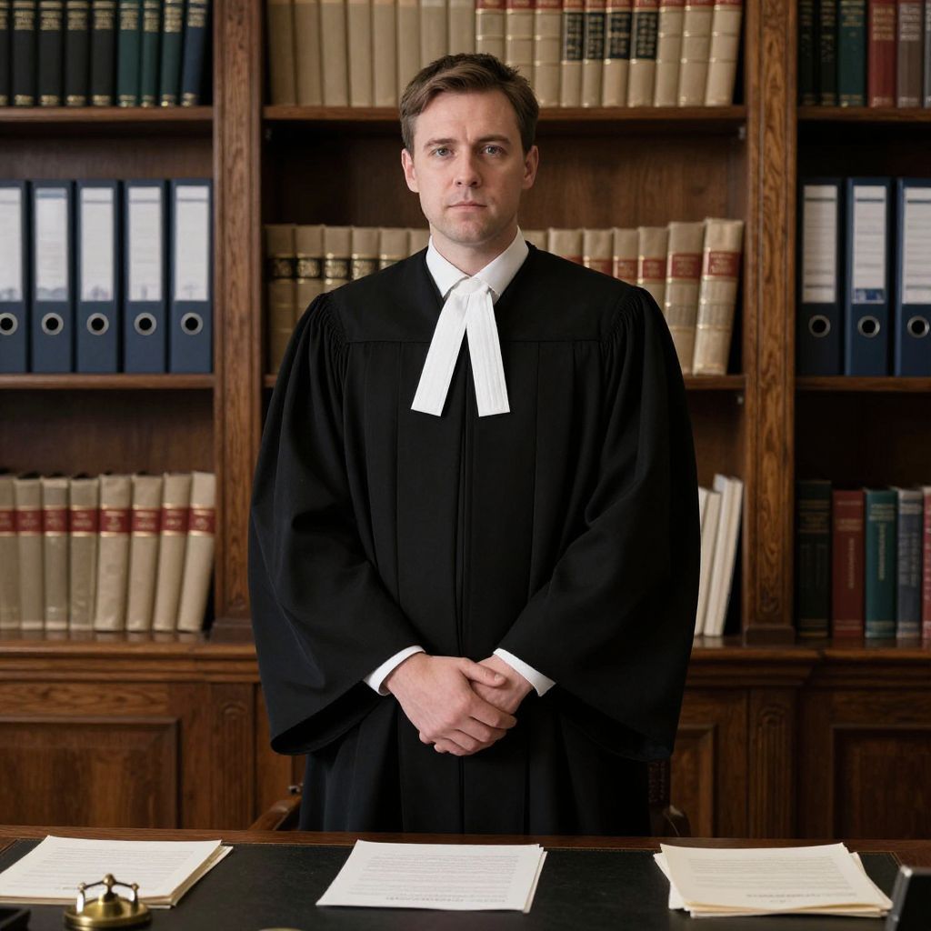 Serious Judge in Wood-paneled Library