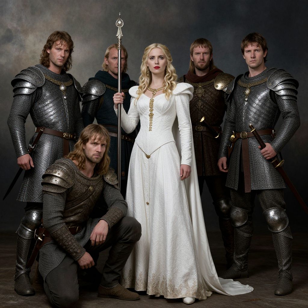 A group of epic medieval heroes, including a woman in a white dress and a man in armor, gather in a dramatic, detailed portrait with dynamic poses and intricate details, set against a moody, cinematic background.