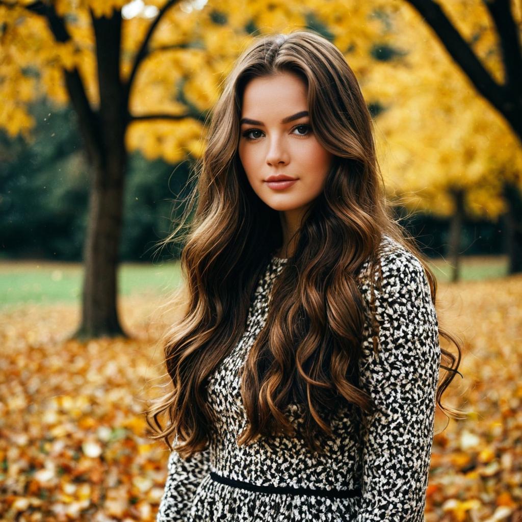 Portrait of a young woman with long wavy brown hair and freckles, wearing a patterned dress with long sleeves. She is standing outdoors in a park during autumn, surrounded by golden-yellow fall leaves and trees with vibrant foliage. The background is softly blurred, highlighting the subject's natural beauty and fall fashion.