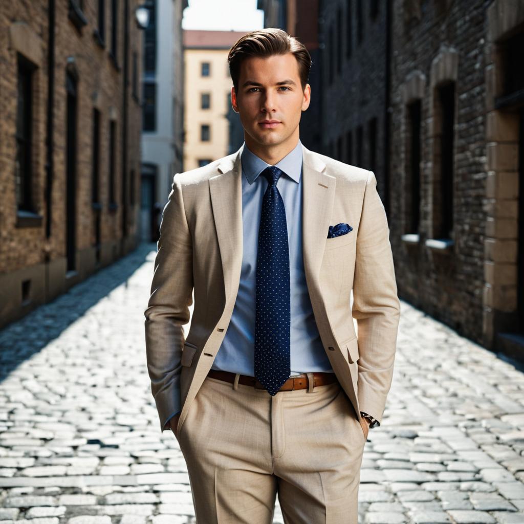 Man wearing dress pants, photorealistic, handsome man in beige suit, blue dress shirt, dark blue tie, pocket square, hands in pockets, standing in cobblestone alley, urban street, blurred background, sunny day, European architecture, light shadows, serious expression, short brown hair, clean-shaven, medium build, white skin, daytime, fashion photograph, stylish, confident, vertical orientation