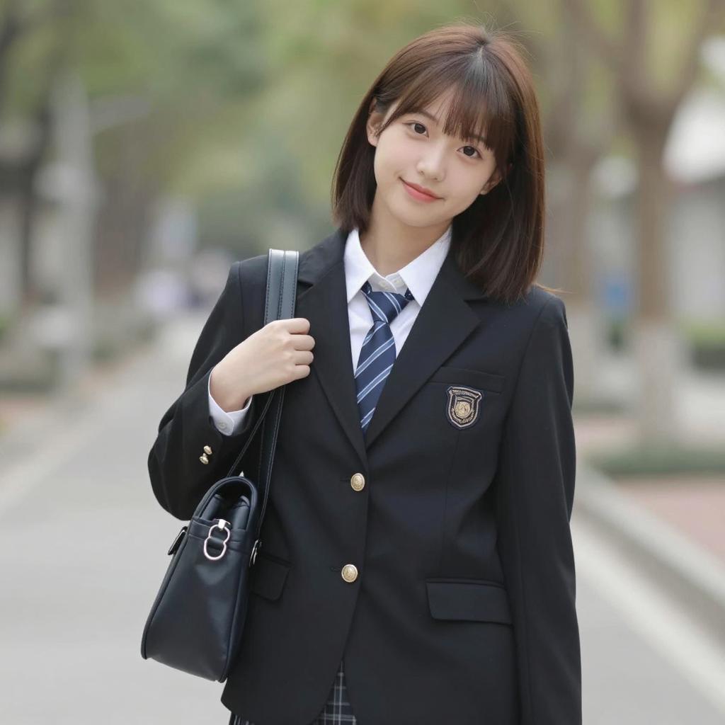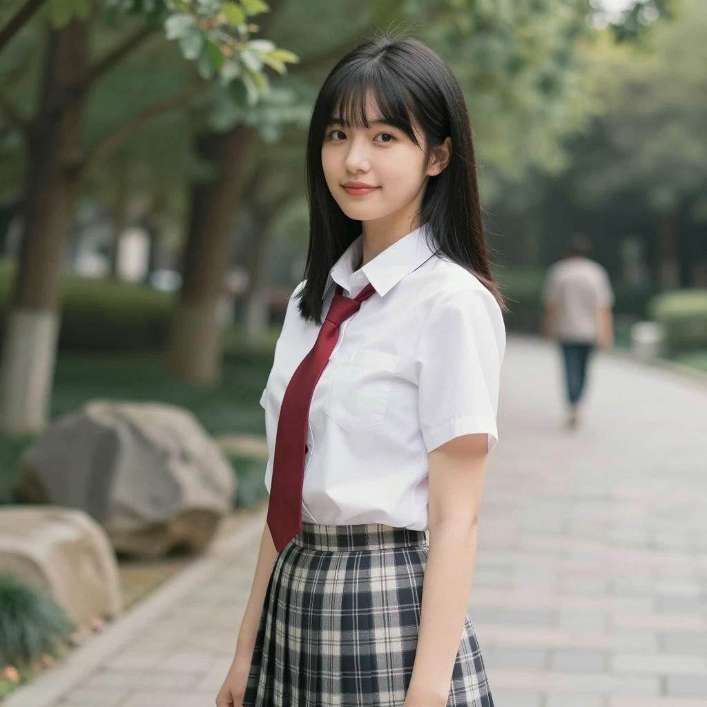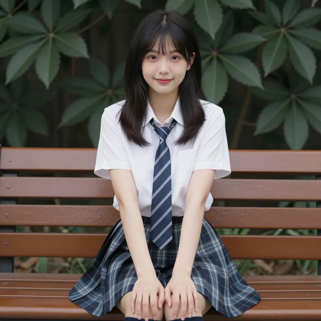 Asian girl with black hair in a school uniform, white shirt with navy blue sailor collar, and black skirt. Sitting cross-legged on a stone ledge, arms resting on knees. Black backpack with pink button to her right. Green blurred background, soft light, early evening. She has a slight, relaxed smile.