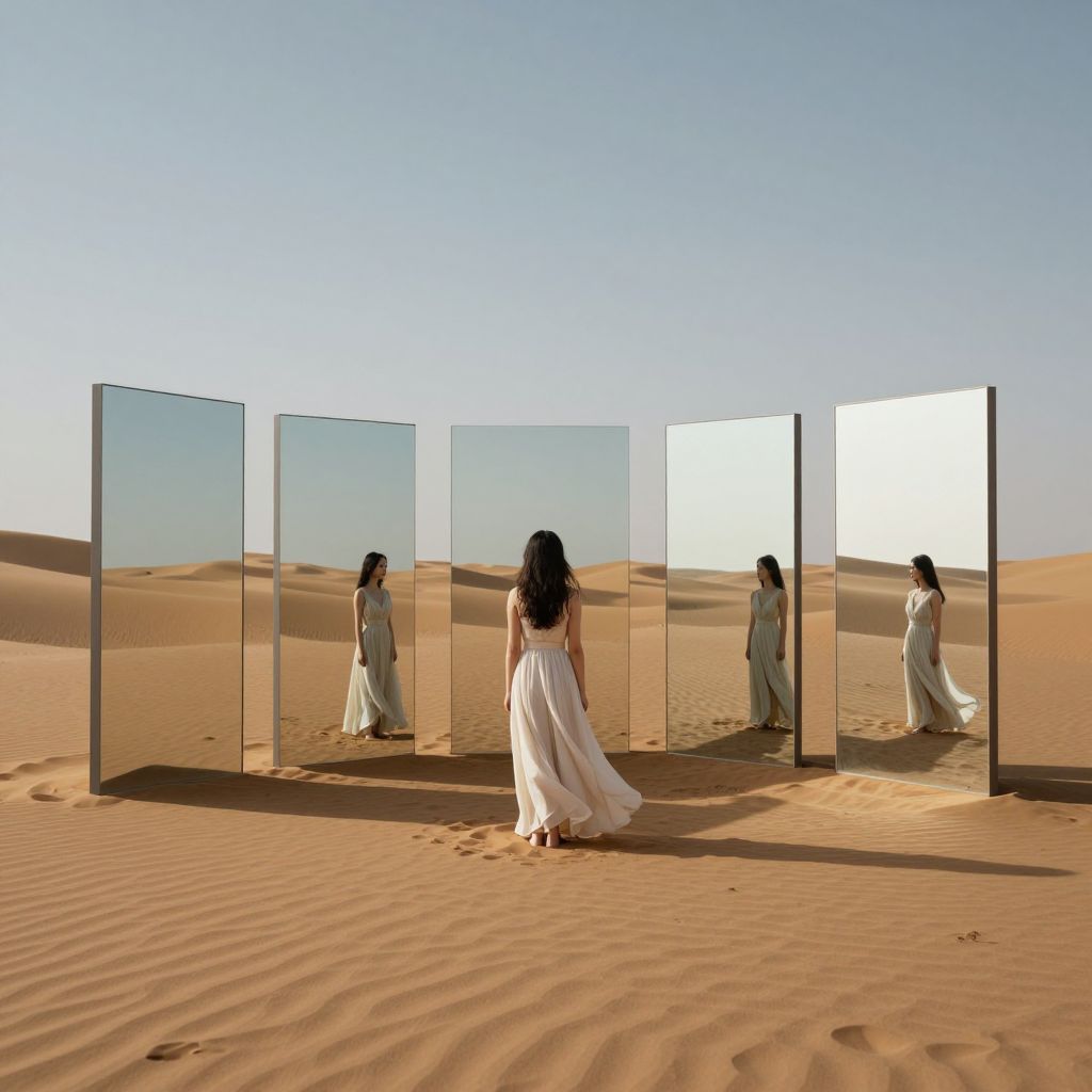 Photograph of a woman with long black hair in a white dress, standing in a desert, facing mirrors reflecting her multiple images. Clear blue sky,