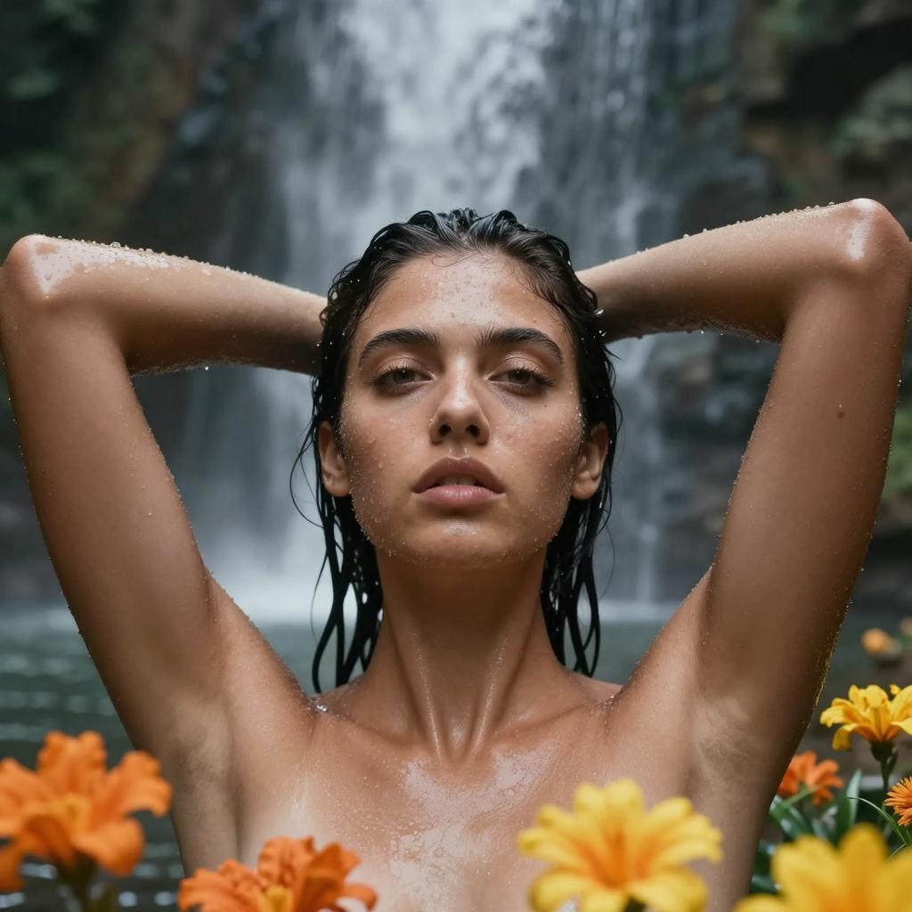 Topless woman with dark skin and wet hair, arms raised behind head, surrounded by orange and yellow flowers. Waterfall in background. Intense gaze upward. Photorealistic image.