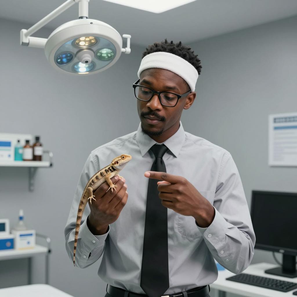 A black man with a thick mustache, wearing gold-rimmed glasses and a white lab coat with a black tie. A small red squirrel is perched on his right shoulder, holding a stethoscope's earpiece in its mouth. His facial expression is surprised. The background is plain white. The man has short, curly black hair and a medium-dark skin tone.