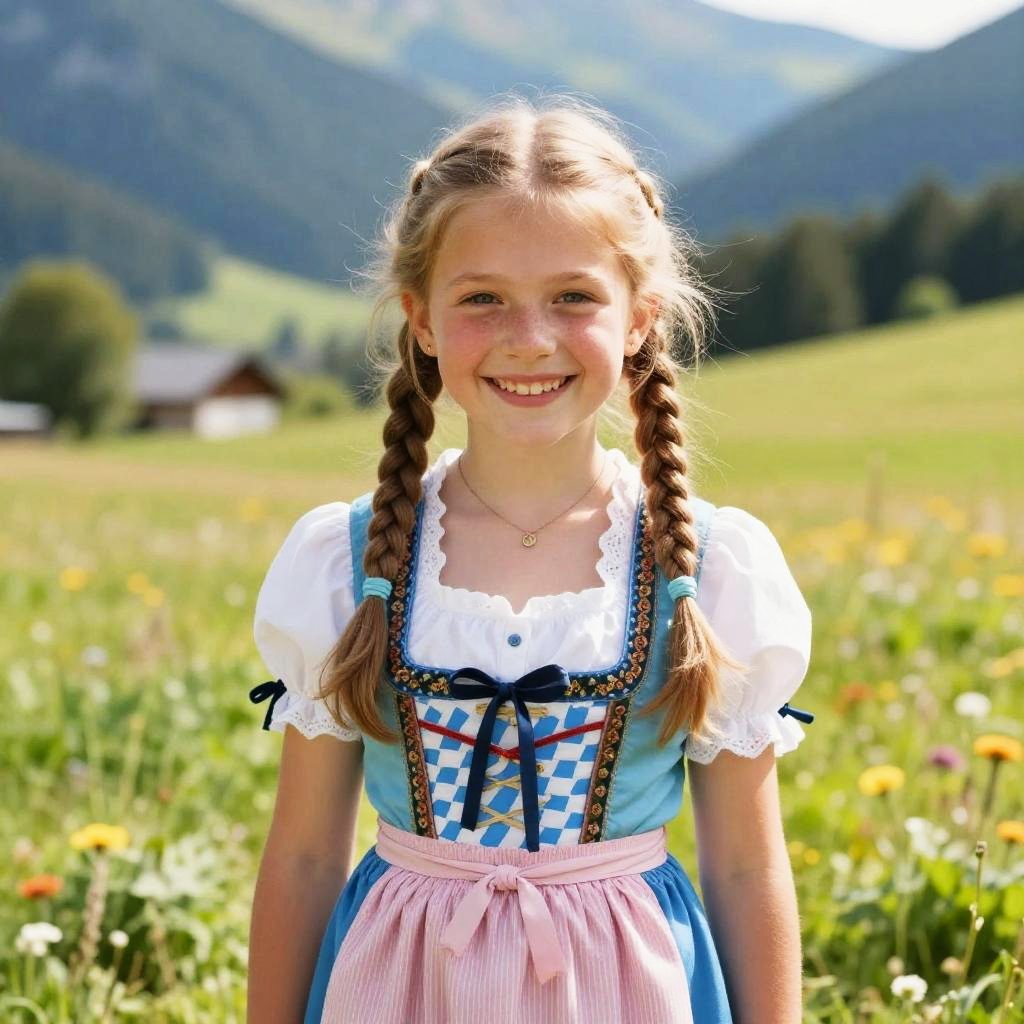 Cute German girl, smiling brightly in a traditional Bavarian dress, sunlit alpine meadow background, soft pastel colors, highly detailed, warm and cheerful atmosphere
