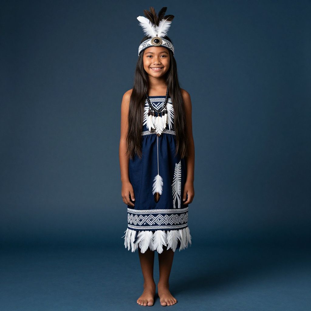 Portrait of a young Māori girl with long straight hair, wearing traditional Polynesian attire including a navy dress with white feather and geometric patterns, paired with feather headpiece and necklace. She stands barefoot against a muted navy studio background, smiling confidently.