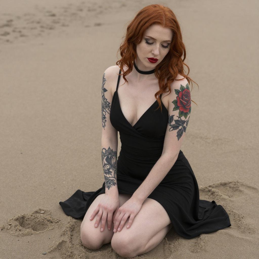 Photograph of a pale-skinned woman with red hair, kneeling on sandy ground. She wears a black, deep V-neck dress, revealing cleavage, and a black choker. Her arms, adorned with intricate tattoos, rest on her thighs. She has red lipstick and a slightly melancholic expression. Her tattoos include a large red rose on her upper arm and detailed black ink designs on her forearms.