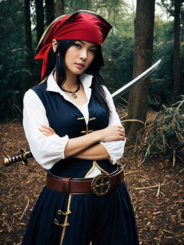 Sexy cosplay woman character wearing Kaname Buccaneer costume. Realistic photo. Jane Doe dressed as Kaname Buccaneer --sref 1399
