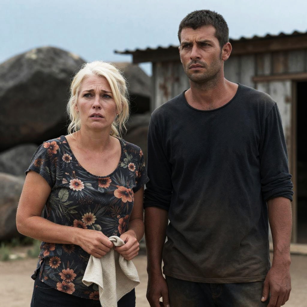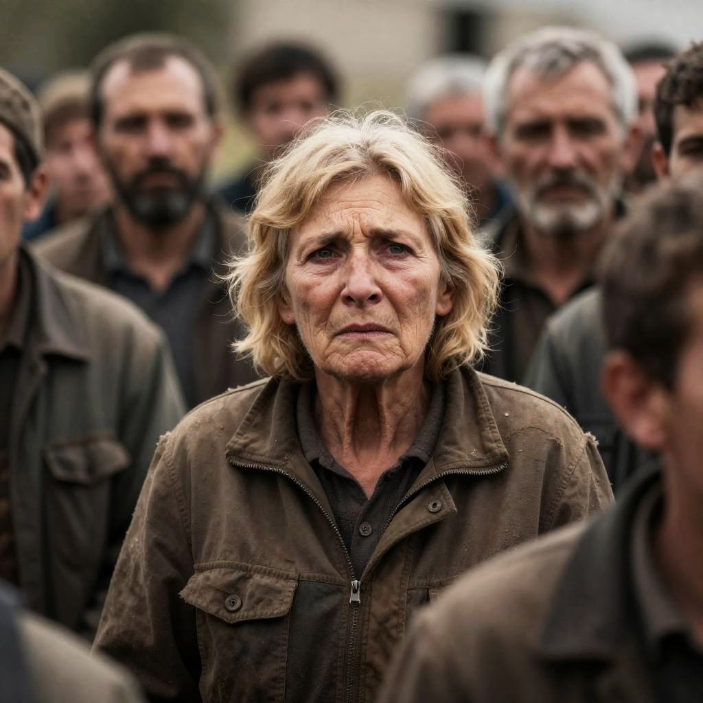 A photograph of a worried elderly woman with blonde, unkempt hair and weathered face, wearing a brown, tattered jacket. She is surrounded by a crowd of people in rustic, worn clothing. The background is blurry with muted colors. Several men are visible, including one with a beard and another with grey hair, both looking at her. The crowd is dense, with a mix of neutral and earthy tones. The woman's intense expression is central to the image.
