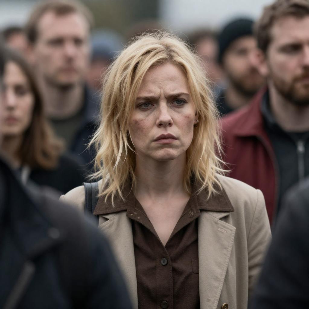 A close-up portrait of a worried elderly Caucasian woman with blonde, unkempt hair and a weathered face, wearing a brown, tattered jacket. She is surrounded by a dense crowd of men dressed in rustic, worn clothing, featuring muted earth tones. The background is blurred, emphasizing the woman's intense and concerned expression as she looks forward.
